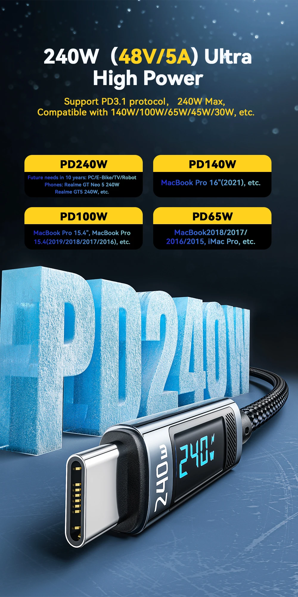 Power: Support 240W PD3.1, backward compatible with PD140W, 100W, 65W, 45W, 30W, etc.