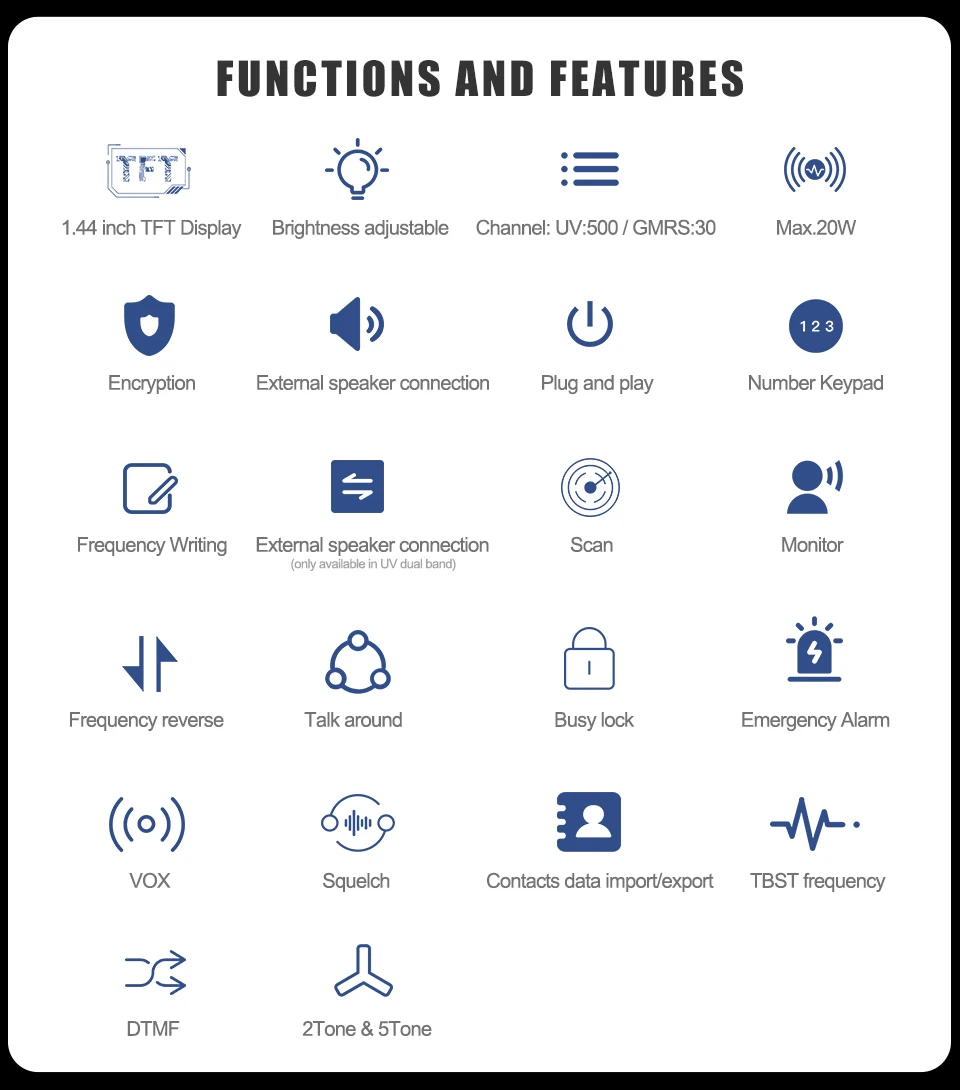 1:VFO/Channel mode switch; 2: 1.44 Inch TFT display; 3:UV dual band 500channels, GMRS 30 Channels, identified by editing name; 4:Amateur and professional mode optional(only available in UV Dual band) 5:CTCSS, DCS, DTMF, 2Tone, 5Tone setting for each single channel; 6:Tone Pulse frequency; 7:Compander function; |