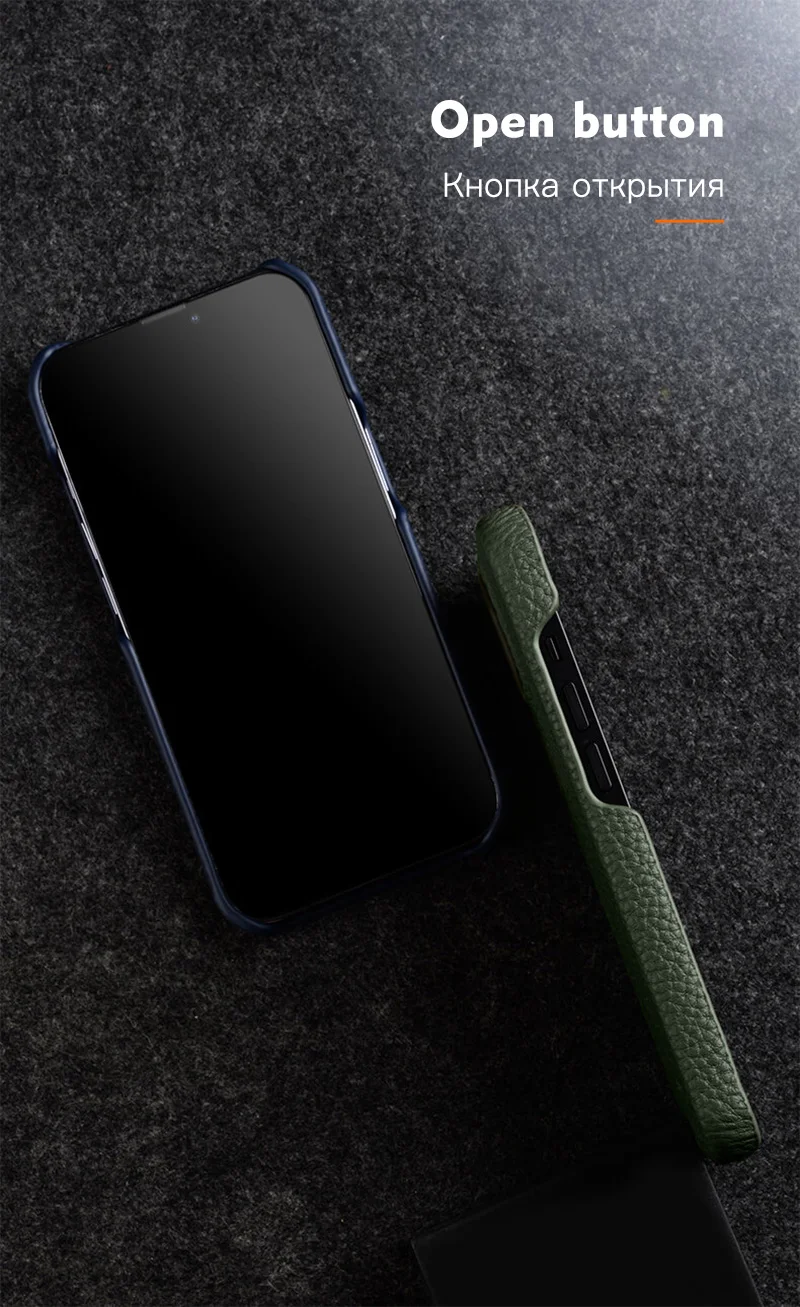 iPhone 15 Pro Max leather case was crafted with premium Cowhide leather and microfiber lining, offers soft nature feel. Elegant leather texture creates a classic and luxury look. The microfiber lining inside helps protect your phone from damaging or scratching, soft and anti-skid.