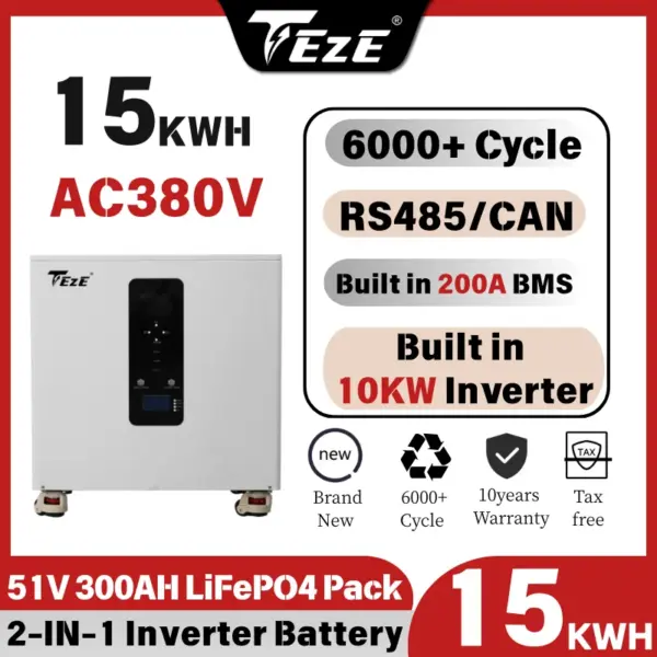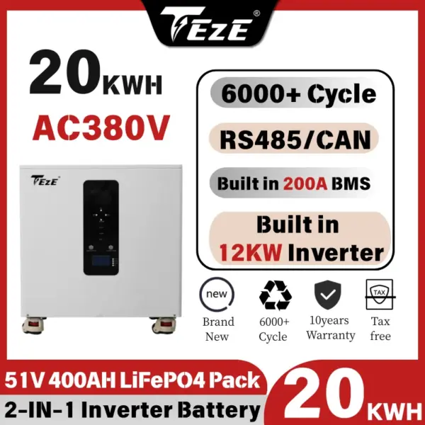 TEZE Three-Phase AC380V 15KWH 20KWH Powerwall 51.2V 300AH/400AH LiFePO4 Battery With Inverter All-in-one 10KW Output Power