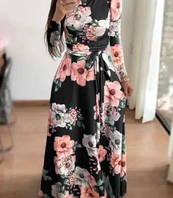 Women’s Slim Dresses Casual Long Sleeve Round Neck Flower Printed Dress Strap Floor-Length Long Skirt Women’s Clothing