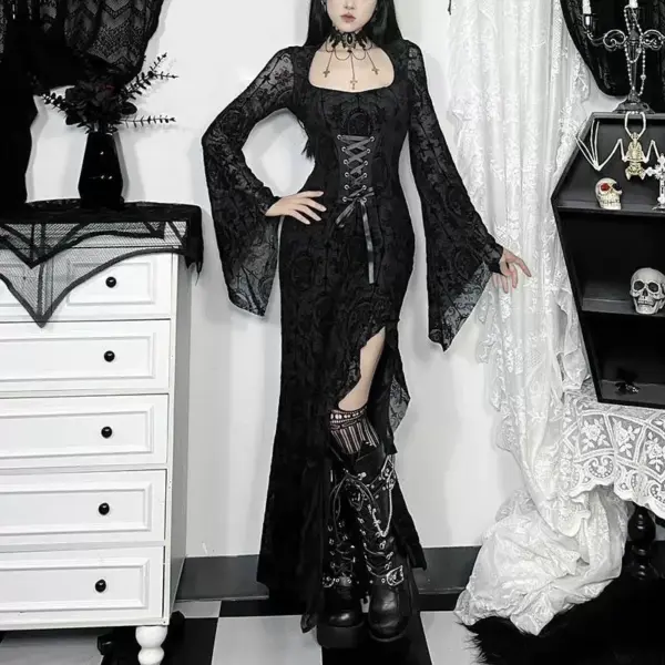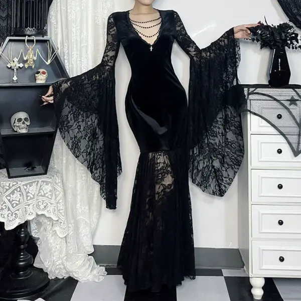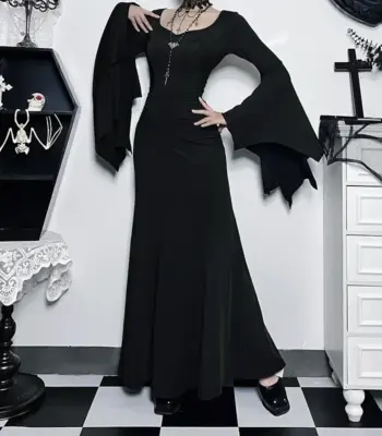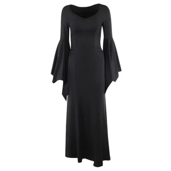 Halloween Costume Women Batwing Sleeve Floor Dress Black Gothic Evil Terror Maxi Mistress Morticia Addam Family Outfit For Adult