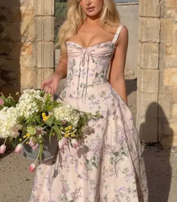 YENKYE 2025 Women Floral Print Fishbone Waist Spaghetti Straps Dress Summer Female Elegant Midi Long Party Dresses Holiday Robe
