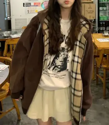 Brown Zip Up Hoodie Women 2023 Autumn Lattice stitching Long Sleeve Casual Oversized Sweatshirt Solid Jacket Women Clothing