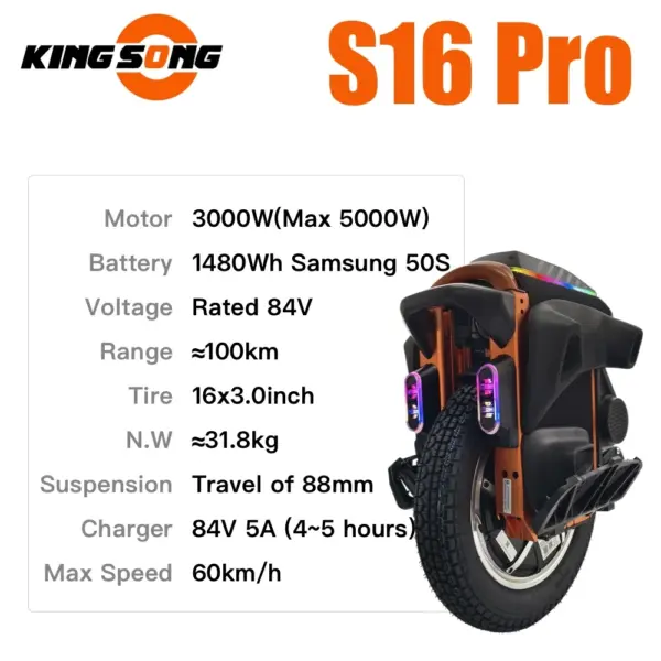 KingSong S16 Pro 3000W Motor Peak 5000W Power 1480Wh 50S 84V Battery 16*3.0inch Tire 88mm Suspension Travel Electric Unicycle