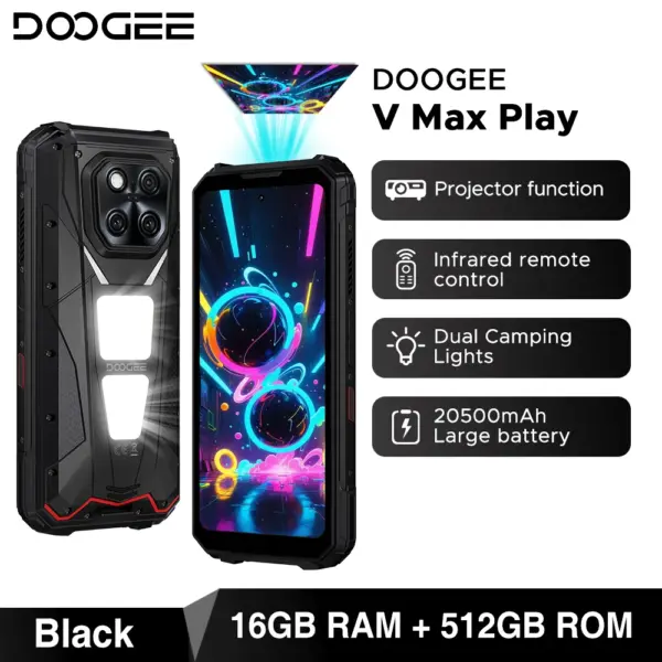 World Premiere DOOGEE V Max Play 5G Projector Rugged Phone 20500mAh Dual Camping Lights Dimensity 7300 16GB+512GB NFC Smartphone