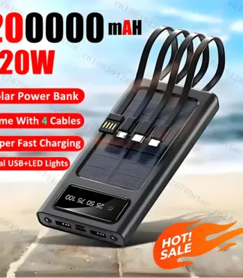 200000mAh Solar Power Bank Large Capacity Super Fast Charging Digital Display 4 Cables External Battery For iphone 16 15 Xiaomi