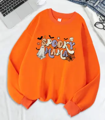 Halloween Spooky Mama Printing Sweatshirts Womens Fleece Warm Loose Hoodies Crewneck Basics Tops Winter Casual Woman Clothes