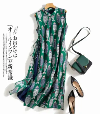 Fish Plaid Print Vintage Cotton Linen O-Neck Sleeveless A-Line Loose Women’s Dress Korean Fashion Mid-Calf Dresses For Women