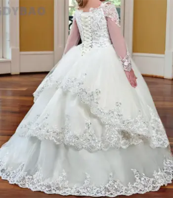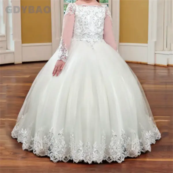 Stunning Flower Girls’ Dresses Ball Gown Long Sleeves Girl’s Party Gowns 3D Applique with Beads Sequins