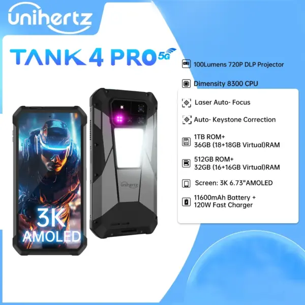 Unihertz by 8849 Tank 4 pro 5G AI Rugged Phone Built-in 720P Projector Dimensity 8300 512GB/1TB ROM 3k AMOLED 11600mAh IP68/IP69