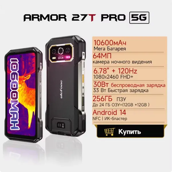 Ulefone Armor 27T Pro 5G Rugged Phone 10600mAh Android 14 Smartphone 50MP+64MP Night Camera 6.78″ 120Hz 24GB+256GB NFC Mobile