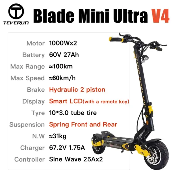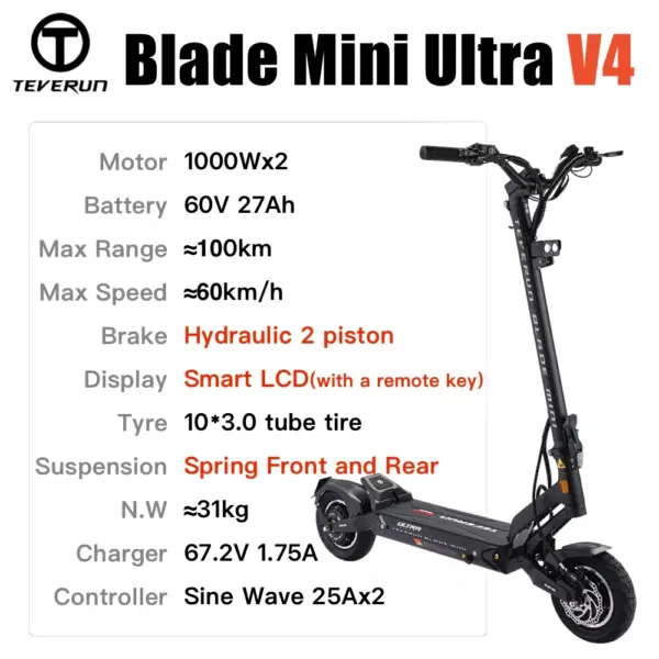 TEVERUN Blade MINI Ultra V4 60V 27Ah Battery 1000W*2 Motor LCD Display With Key 10inch Tubeless Tire Electric Scooter
