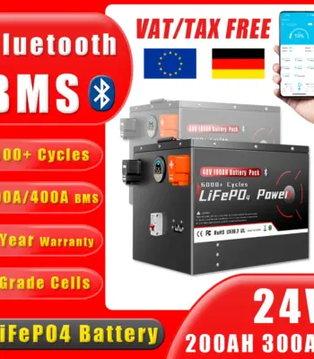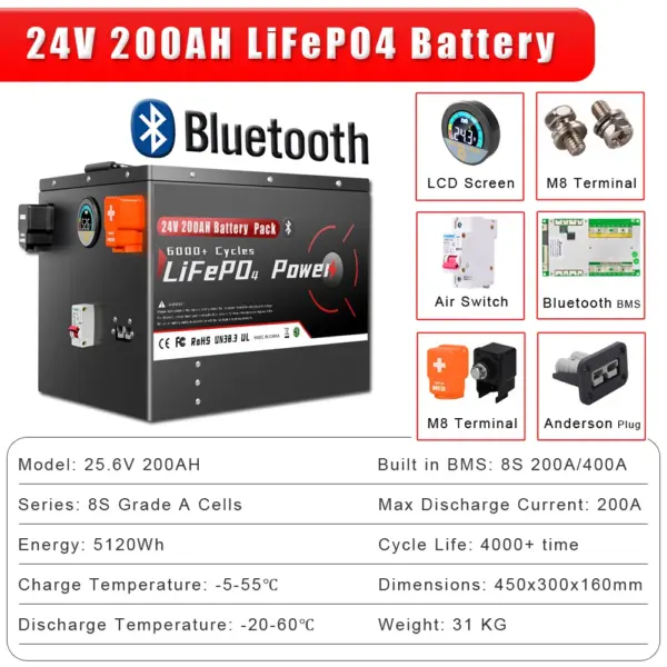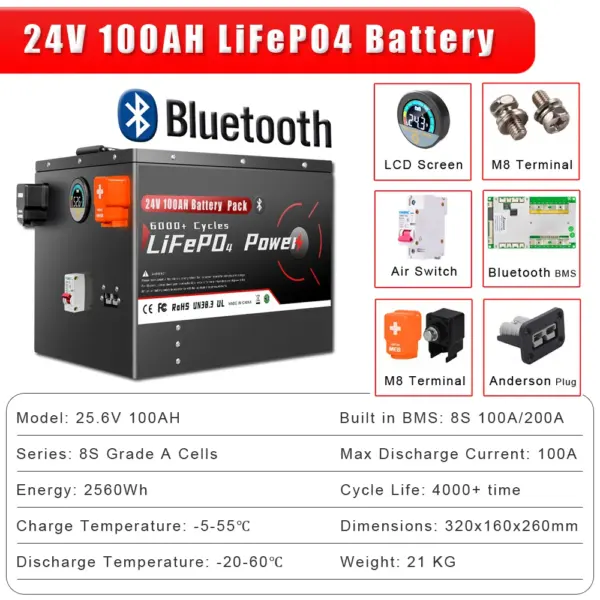 24V 100Ah 200Ah 300Ah LiFePO4 Battery Pack Bluetooth BMS Grade A 6000+ Deep Cycle For Solar Home Storage RV Boat Inverters PV