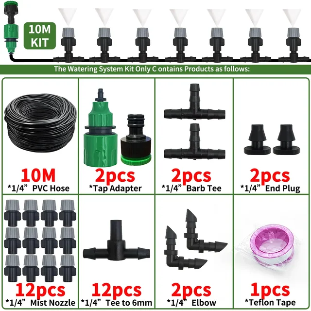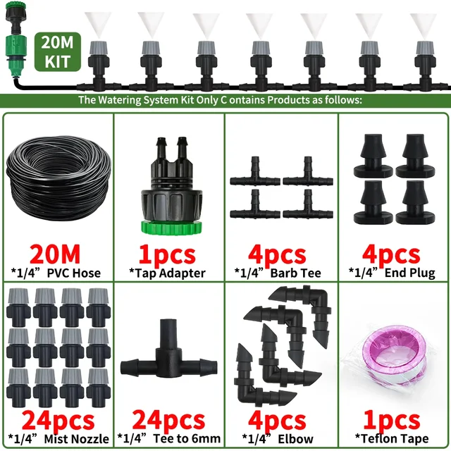 10-20M DIY Drip Irrigation System Mist Nozzle Watering Garden Hose Tee Lock Drip Watering Kits Adjustable Sprinkler