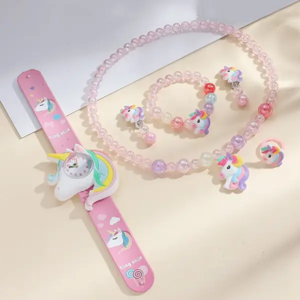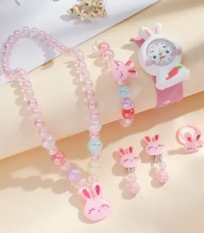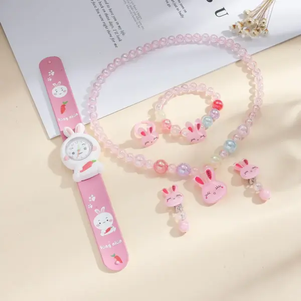 Childrens Kids Cartoon Rabbit Pattern Watch Jewelry Set Necklace Earrings Ring Bracelet Gifts for Children and Girls