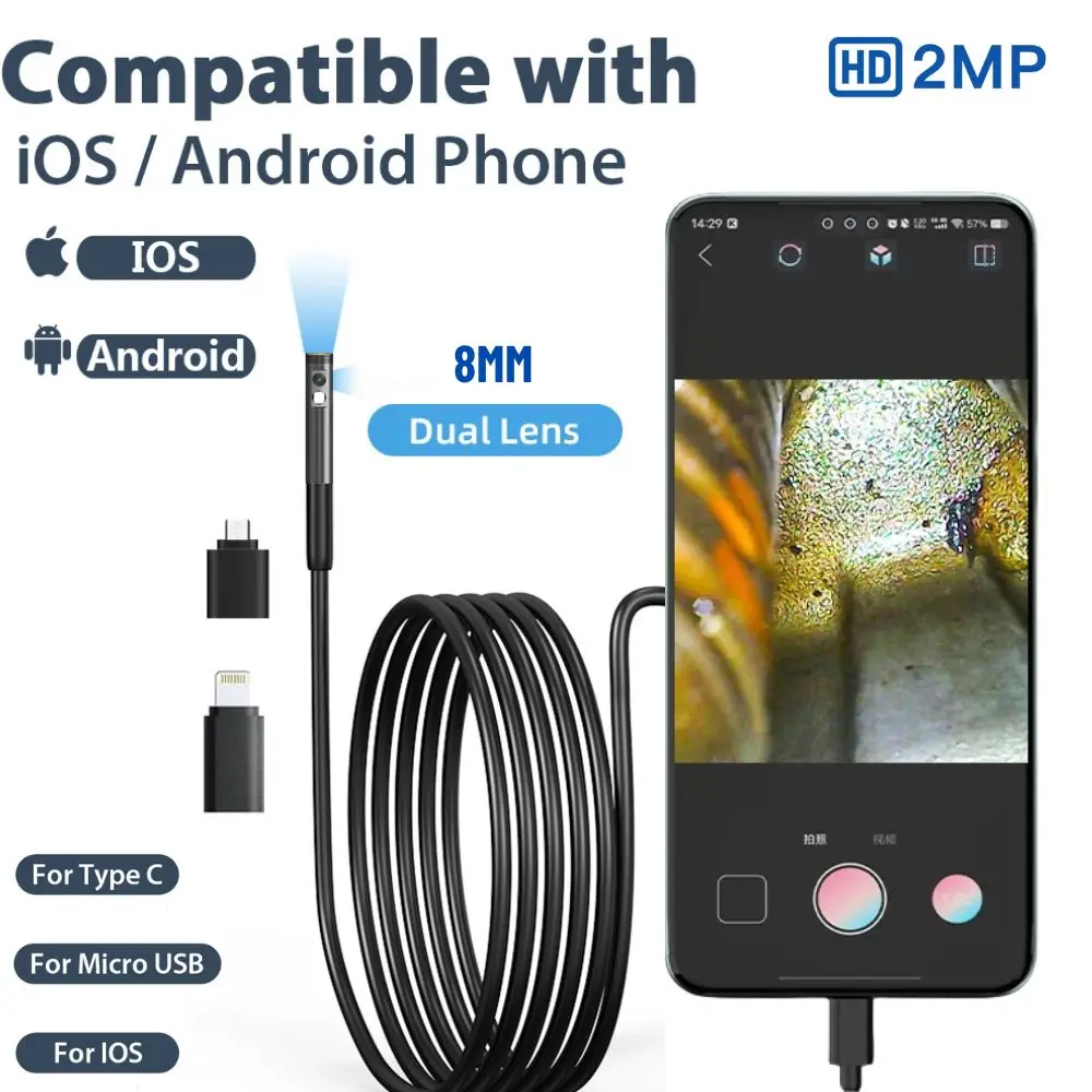2MP Endoscope Inspection Camera for iOS android Single/Dual Lens 8MM Hard Wire Automotive Boroscope IP67 Waterproof Endoscope