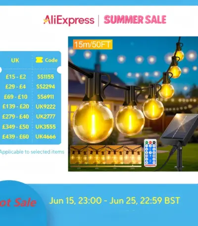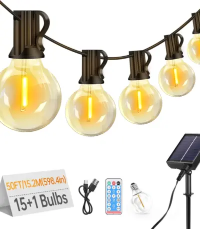 G40 15M/50FT Solar String Lights Outdoor 24V Patio Lights Shatterproof Remote Control for Camping Wedding Party Decoration