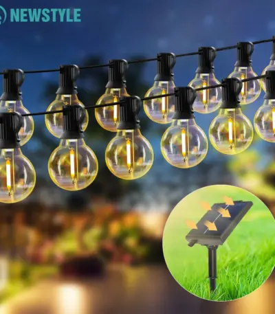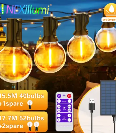 Solar String Lights Outdoor G40 Patio Lights, USB Recharger, 8 Light Modes, Shatterproof Bulbs , Weatherproof Hanging Light