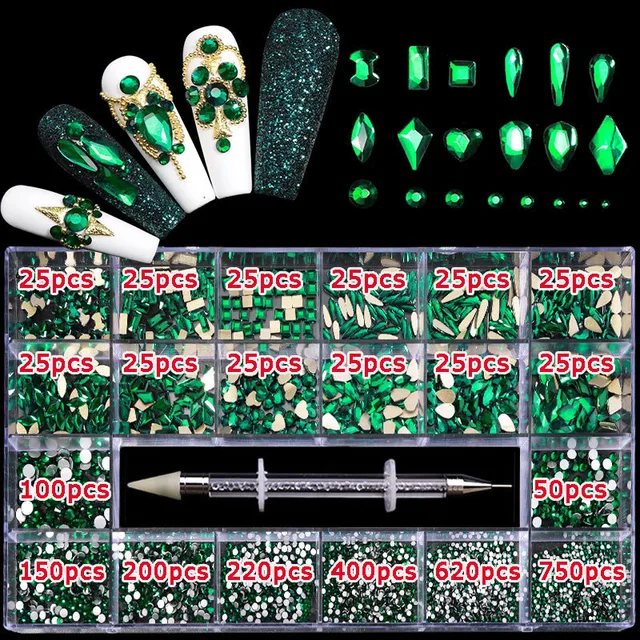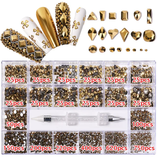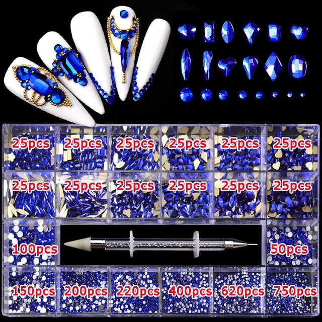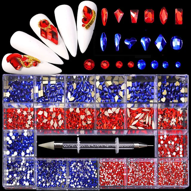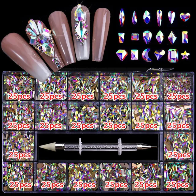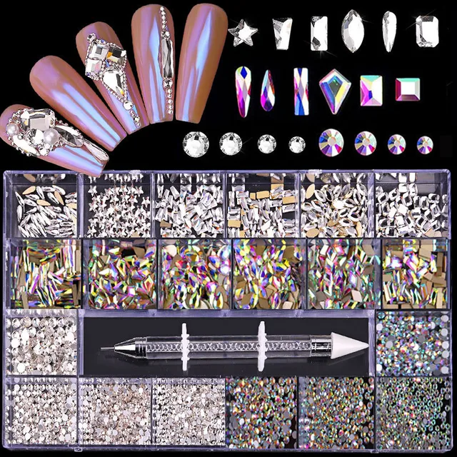 2800pcs Luxury Shiny Diamond Nail Art Rhinestones Crystal Decorations Set AB Glass 1pcs Pick Up Pen In Grids Box 21 Shape