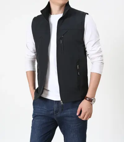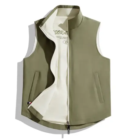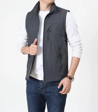 Men’s 2025 summer vest jacket, outdoor fishing vest, solid color stand up collar, hiking without cuff pocket