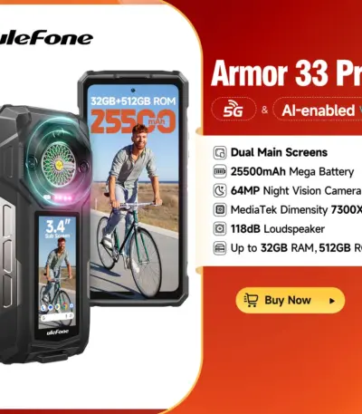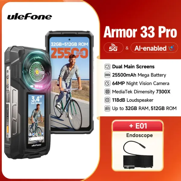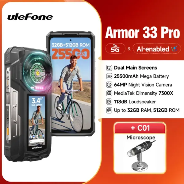 【2025 New】Ulefone Armor 33 Pro 5G Rugged Phone 25500 mAh 512GB ROM 120Hz Dual Screen NFC Android Smartphone MTK Dimensity 7300