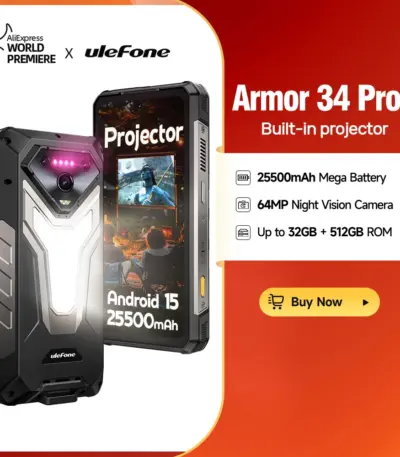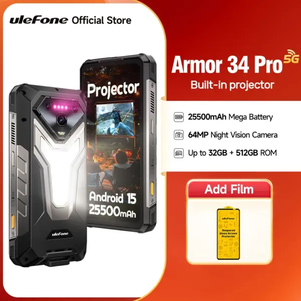 【NEW】Ulefone AI Smartphone Armor 34 Pro 5G 25500mAh Built-in Projector 512GB ROM 120Hz 6.95″ NFC Smartphone Mobile Phone