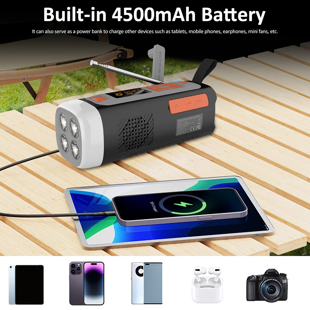 4500mAh Emergency AM/FM/SW Radio Bluetooth-Compatible Speaker USB C/Solar/Hand Crank Charging 3 Ways Powered for Outdoor Camping