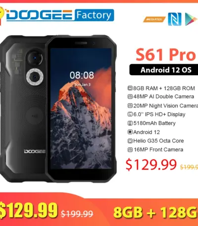 DOOGEE S61 Pro 8GB 128GB Cellphones Rugged Mobile Phone 6.0 Inch Display 48MP Night Vision Camera 5180mAh Android 12 Smartphone