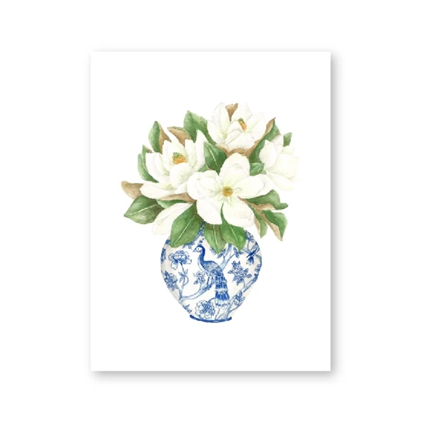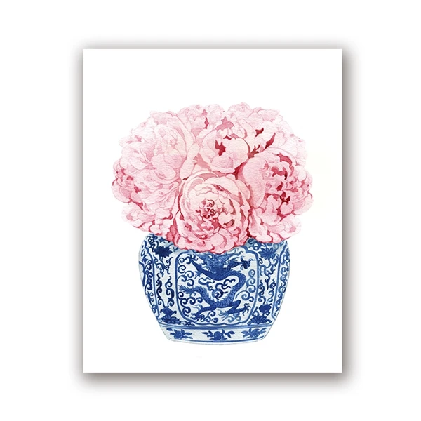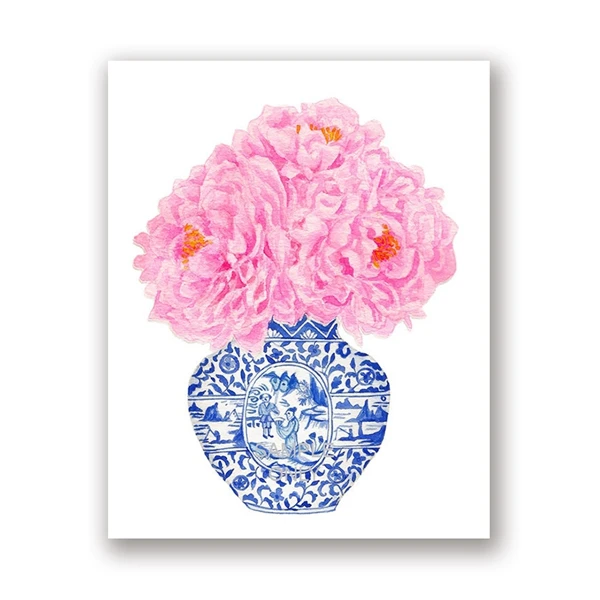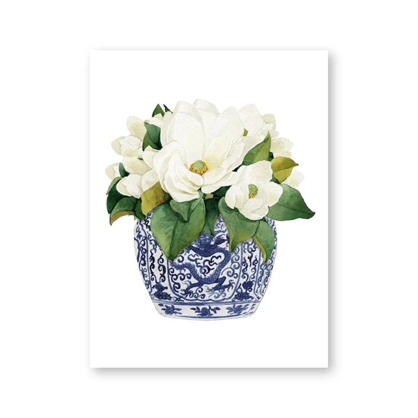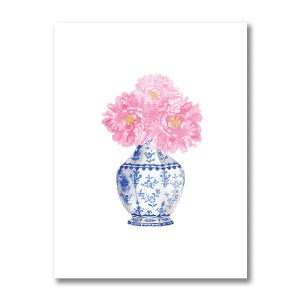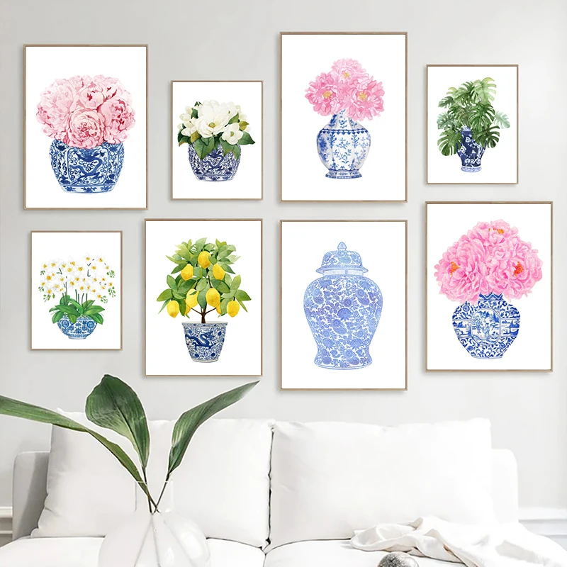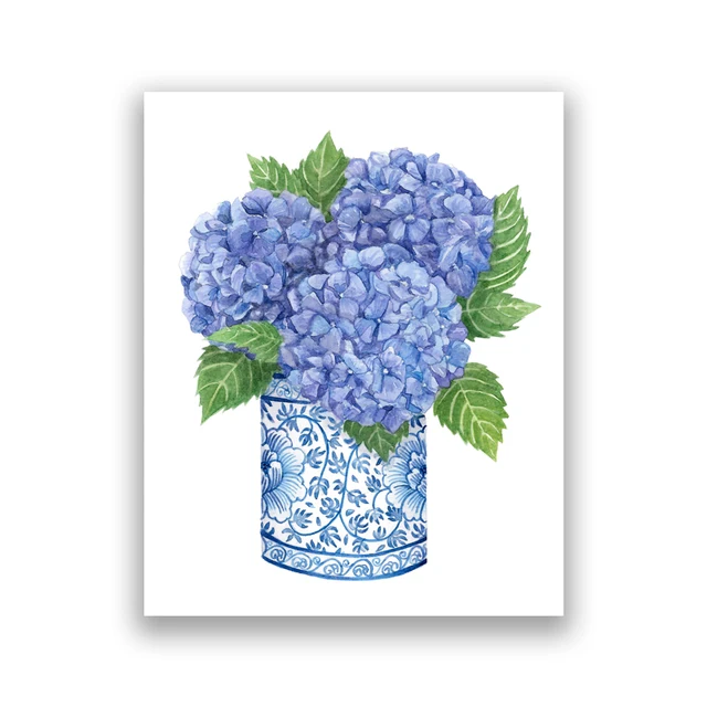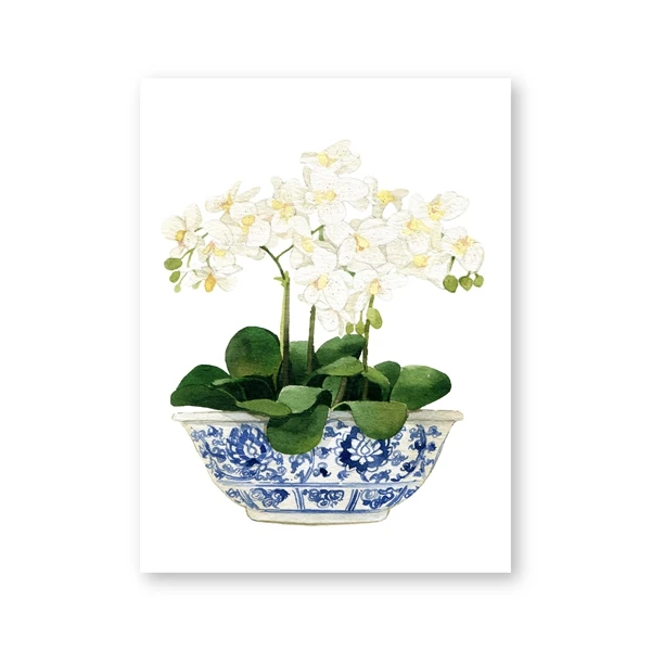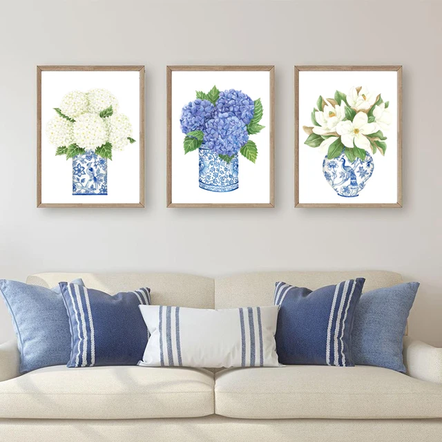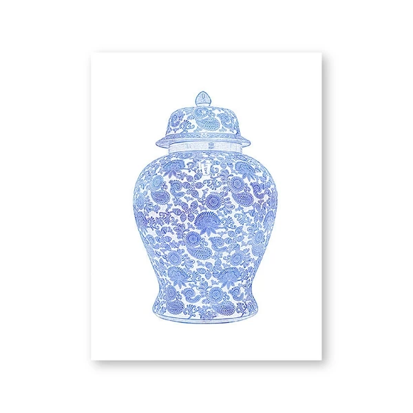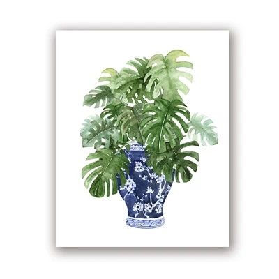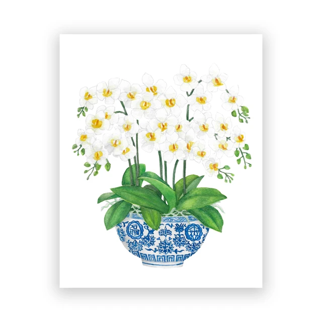 Blue White Willow Style Ginger Jar Watercolor Chinoiserie Decor Canvas Painting Orchid Oriental Vase Porcelain Flower Jar Prints