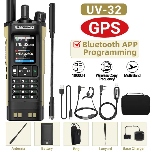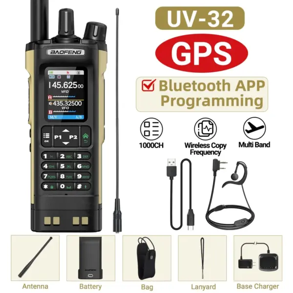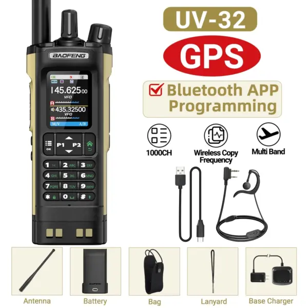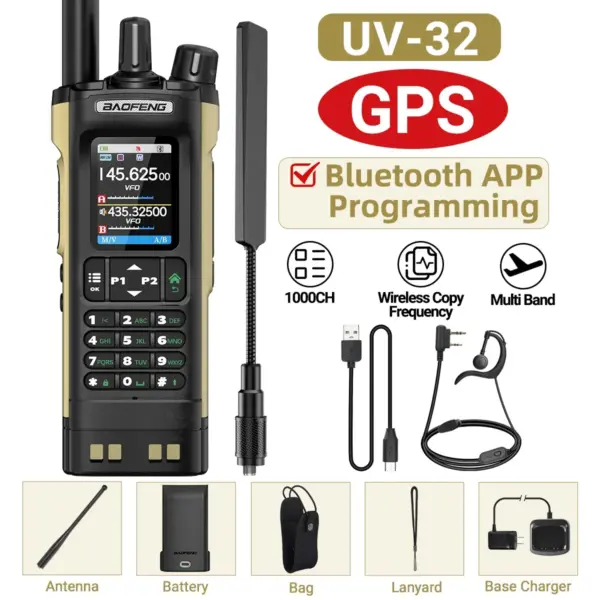 BAOFENG UV-32 Walkie Talkie GPS Multi Band 10W Bluetooth Wireless Programming Copy Frequency 1000CH Long Range Ham Two Way Radio