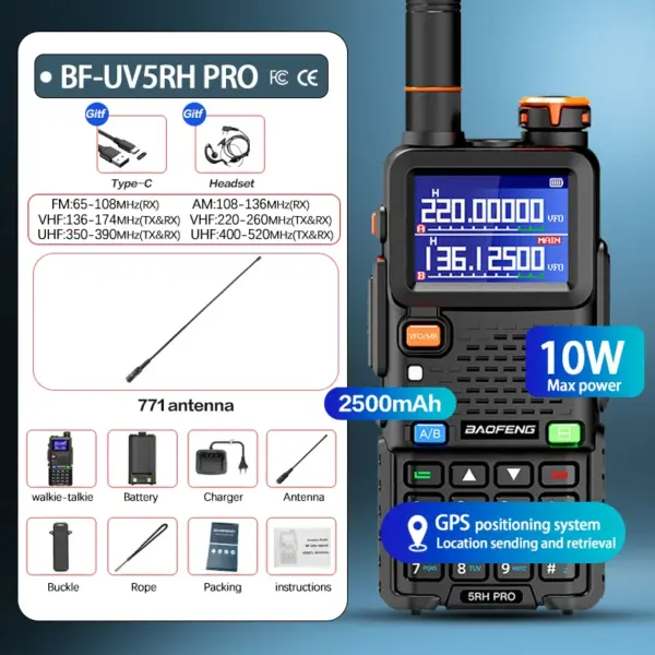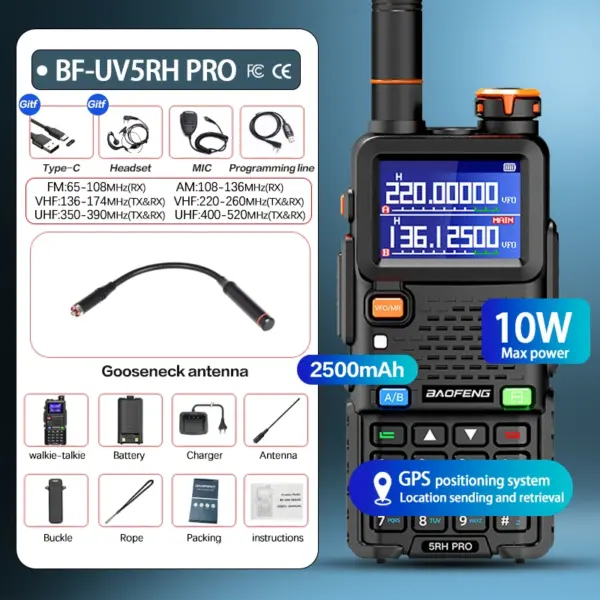 Baofeng UV-5RH PRO GPS Walkie Talkie Long Range Multi Band Wirless Copy Frequency NOAA Type-c Portable Tow Way Radio For Hunting