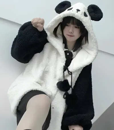 Winter Kawaii Hoodies Women Panda Ears Hooded Sweatshirt Plush Balls Zip-up Loose Cute Sudadera Teenager School Girls JK Clothes