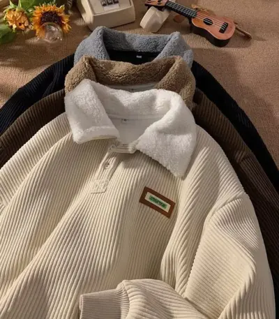 Women Vintage Harajuku Hoodies Oversized Plus Velvet Thickened Corduroy Button Sweatshirts Pullover Warm Contrasting Polo Hoodie