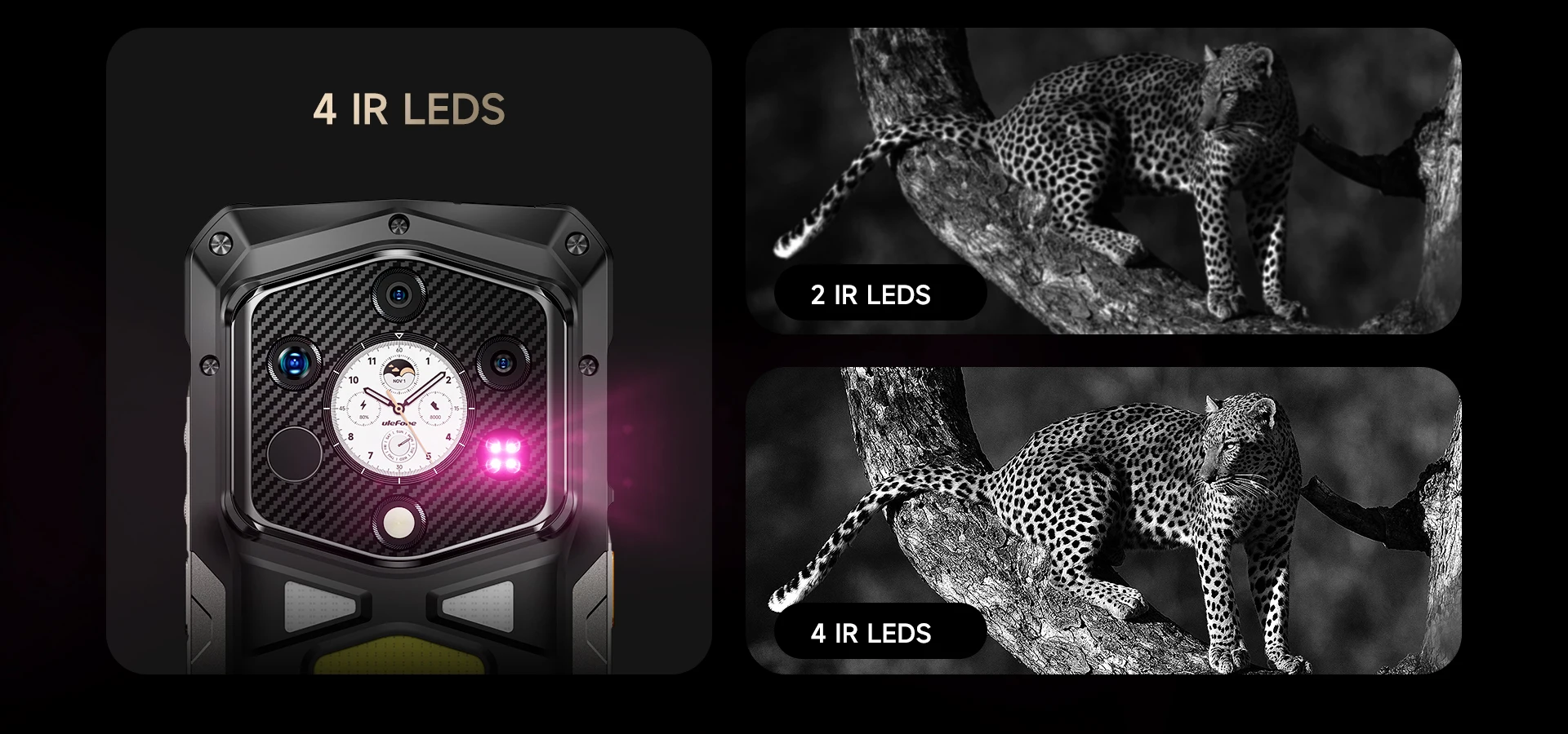 Our infrared night vision camera brightens the night, equipped with a high-resolution 64MP OMNIVISION OV64B sensor and enhanced by Ulefone’s NightElf 3.0 technology. The upgrade to 4 infrared LEDs significantly improves brightness and clarity, providing superior image quality and detail even at greater distances.