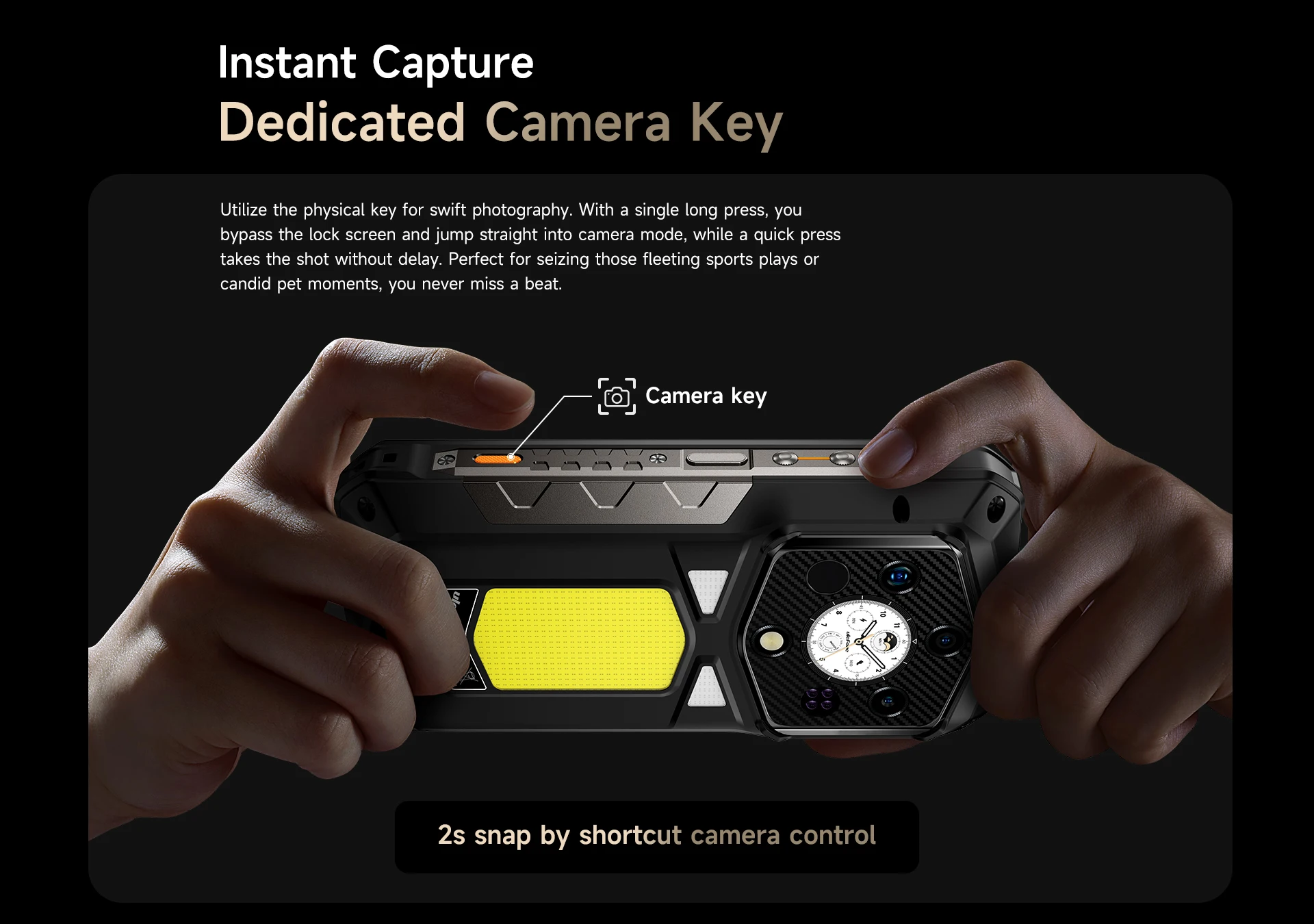 Utilize the physical key for swift photography. With a single long press, you bypass the lock screen and jump straight into camera mode, while a quick press takes the shot without delay. Perfect for seizing those fleeting sports plays or candid pet moments, you never miss a beat.