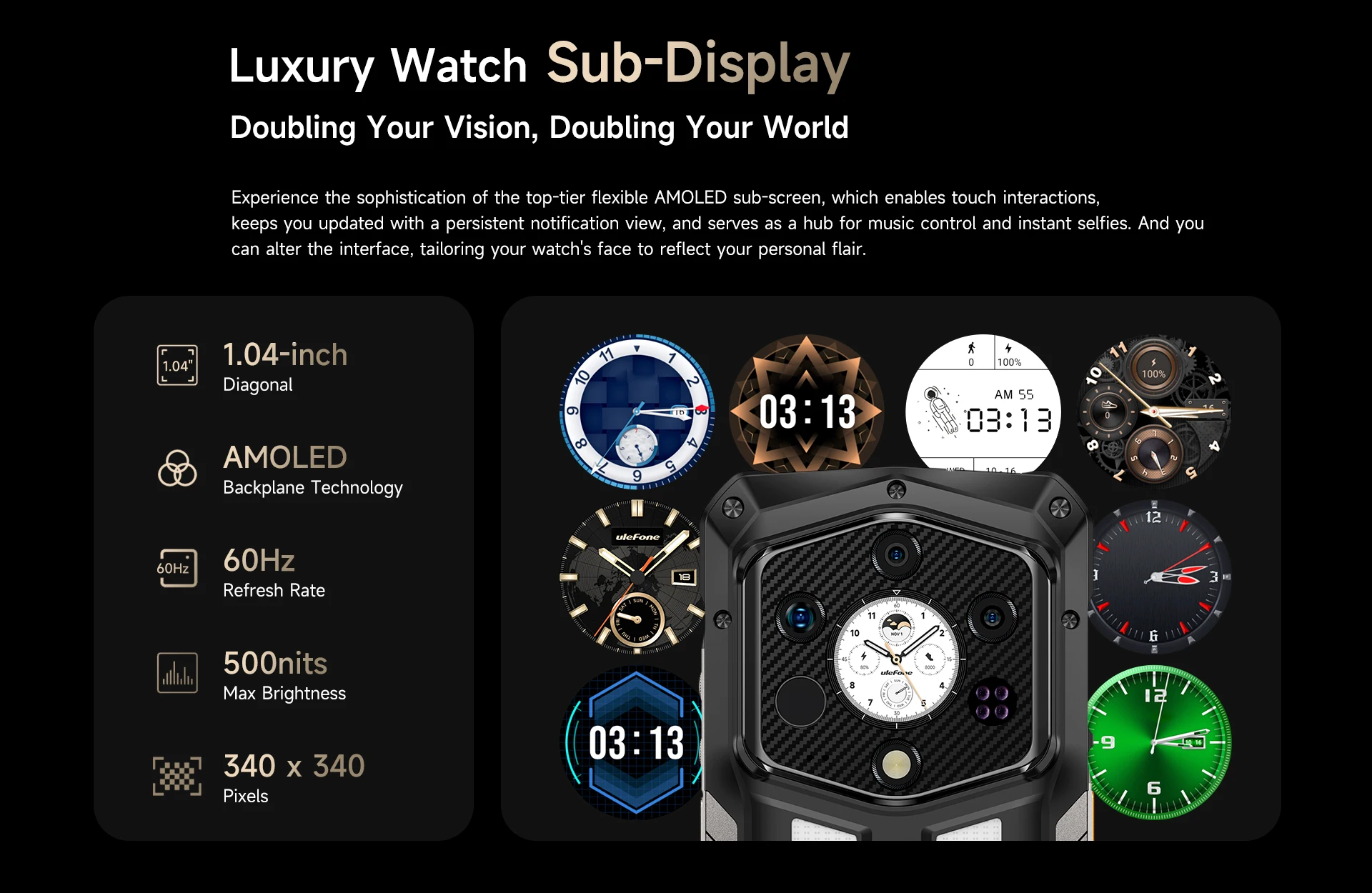 Experience the sophistication of the top-tier flexible AMOLED sub-screen, which enables touch interactions, keeps you updated with a persistent notification view, and serves as a hub for music control and instant selfies. And you can alter the interface, tailoring your watch’s face to reflect your personal flair.