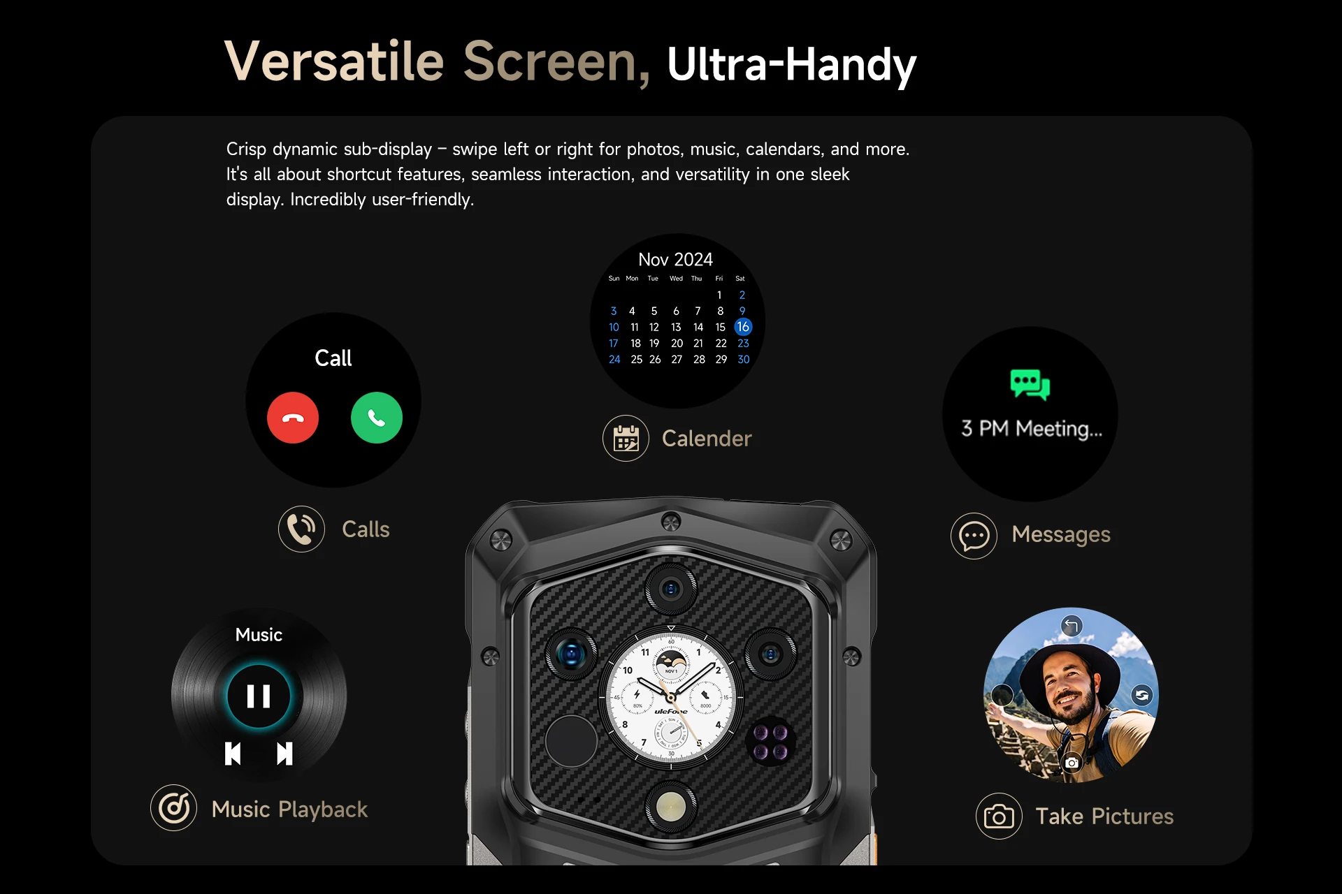 Crisp dynamic sub-display – swipe left or right for photos, music, calendars, and more. It’s all about shortcut features, seamless interaction, and versatility in one sleek display. Incredibly user-friendly.