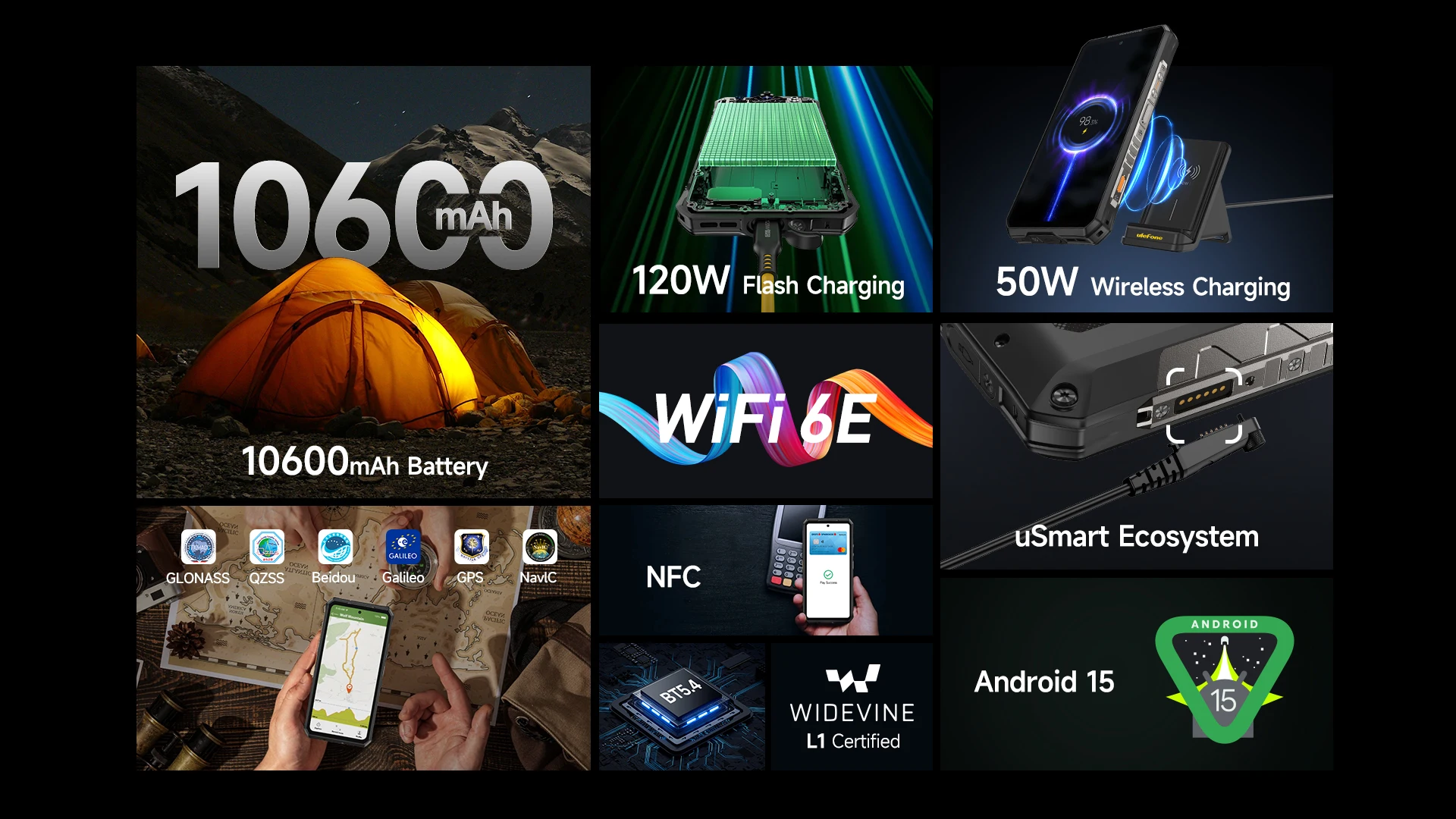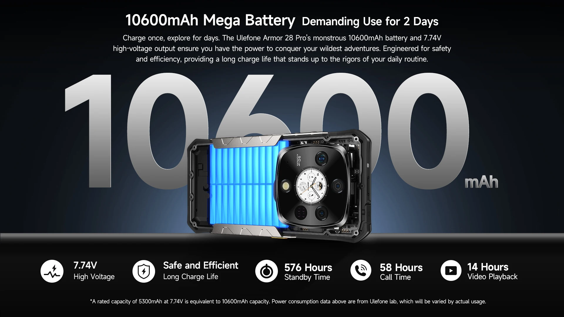 *A rated capacity of 5300mAh at 7.74V is equivalent to 10600mAh capacity. Power consumption data above are from Ulefone lab, which will be varied by actual usage.