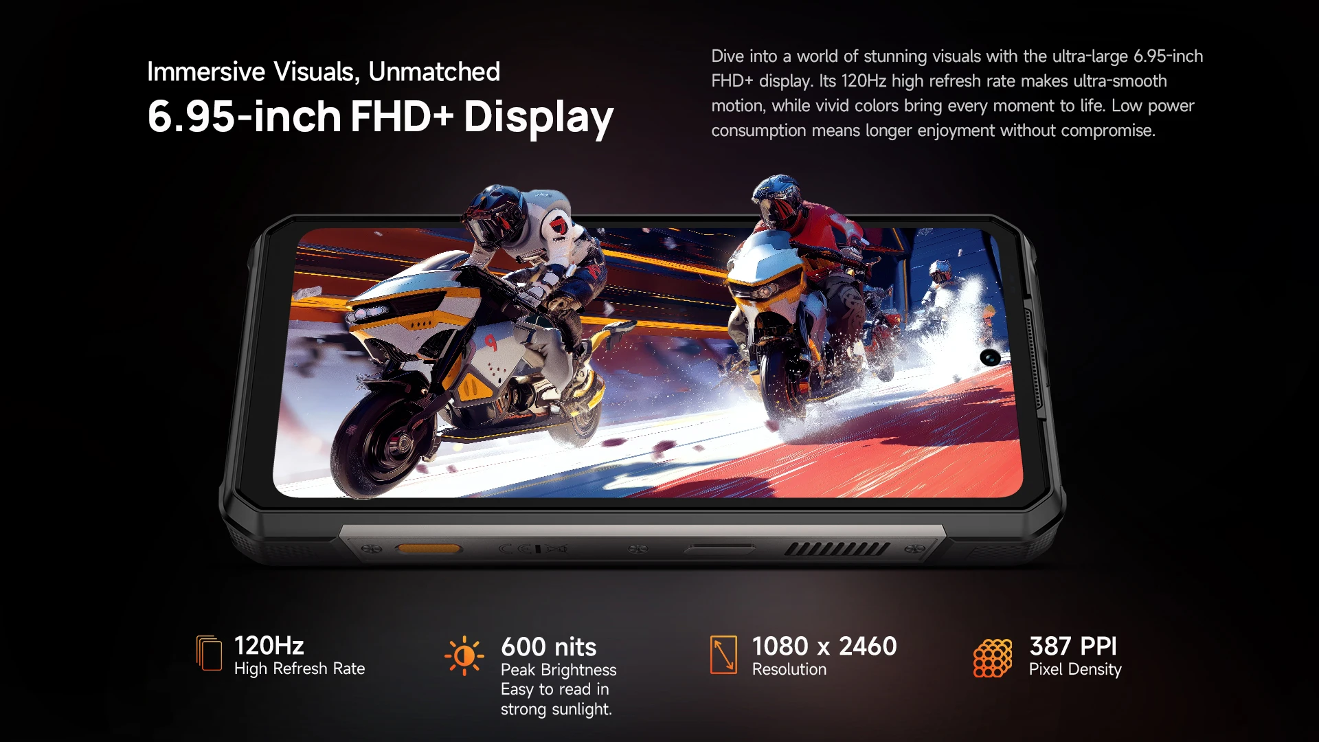 6.95-inch FHD+ Display| 600nits |120Hz | 1080×2460 | 387 PPI