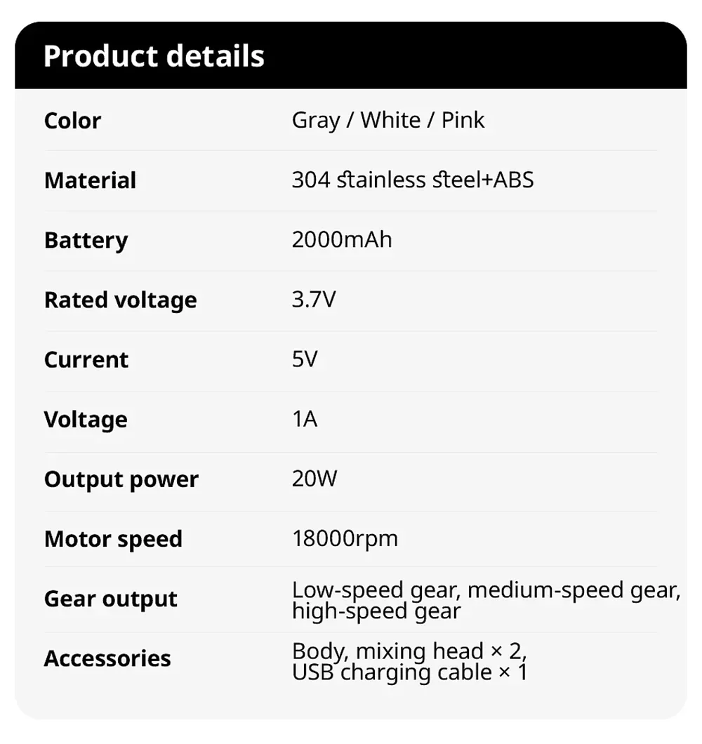 1 color box packaging, 1 egg beater body, 2 mixing heads, a data line