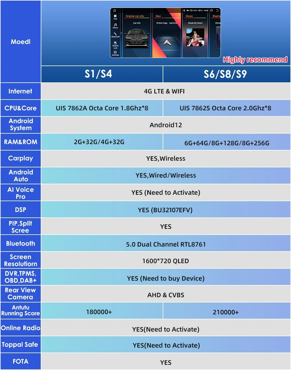 Android 12 / 8Core CPU / 4G NET / Voice Control / wireless Carplay / Android Auto / DSP / RDS / DVR / OBD2 / TPMS / 1600*720(1080P Full HD Screen) / Bluetooth / Steering Wheel Control / GPS / Original Car Infomation