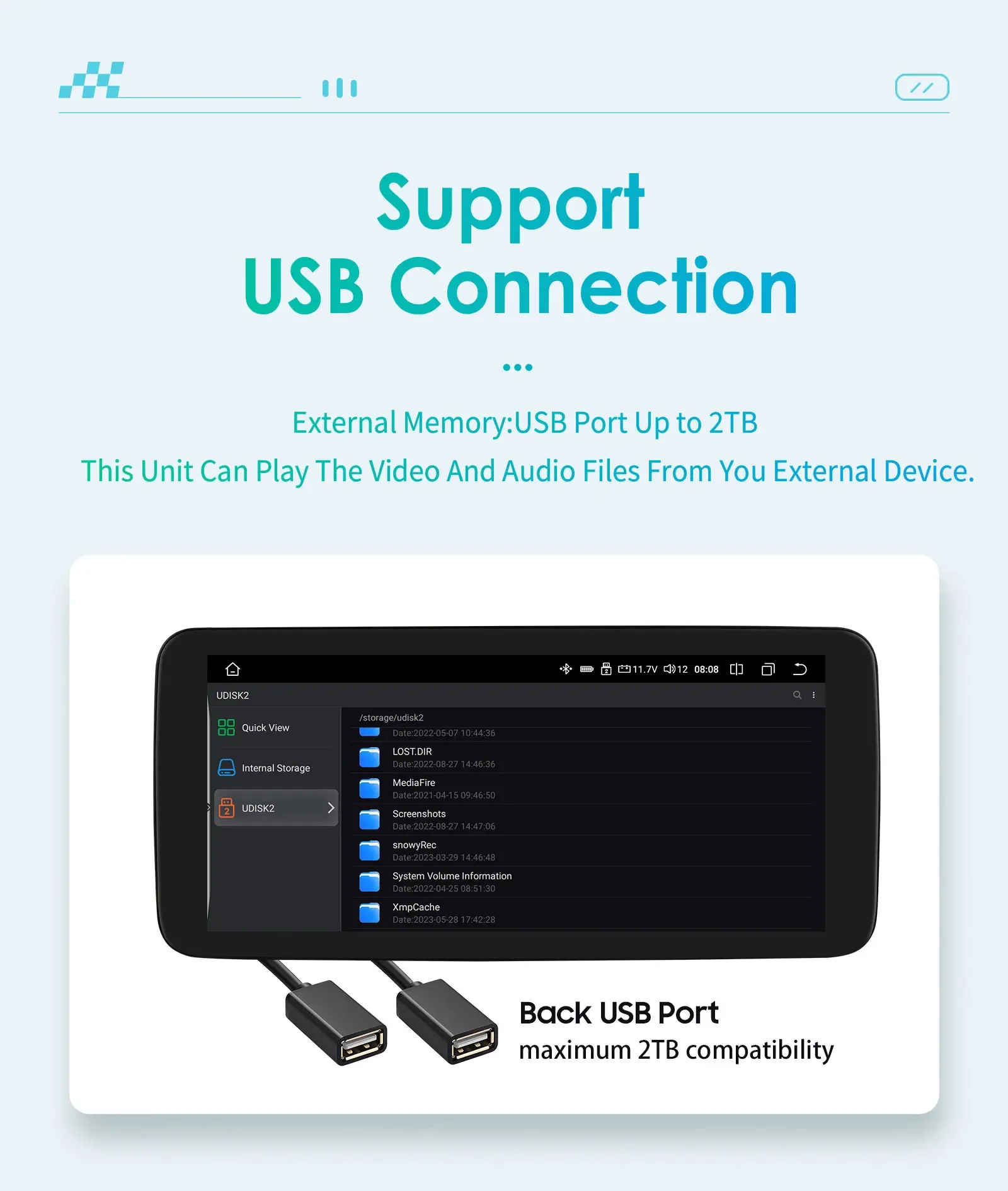 can support to display the video and Audio files from USB External device. (External Memory : Back USB Port Up to 2TB compatibility )