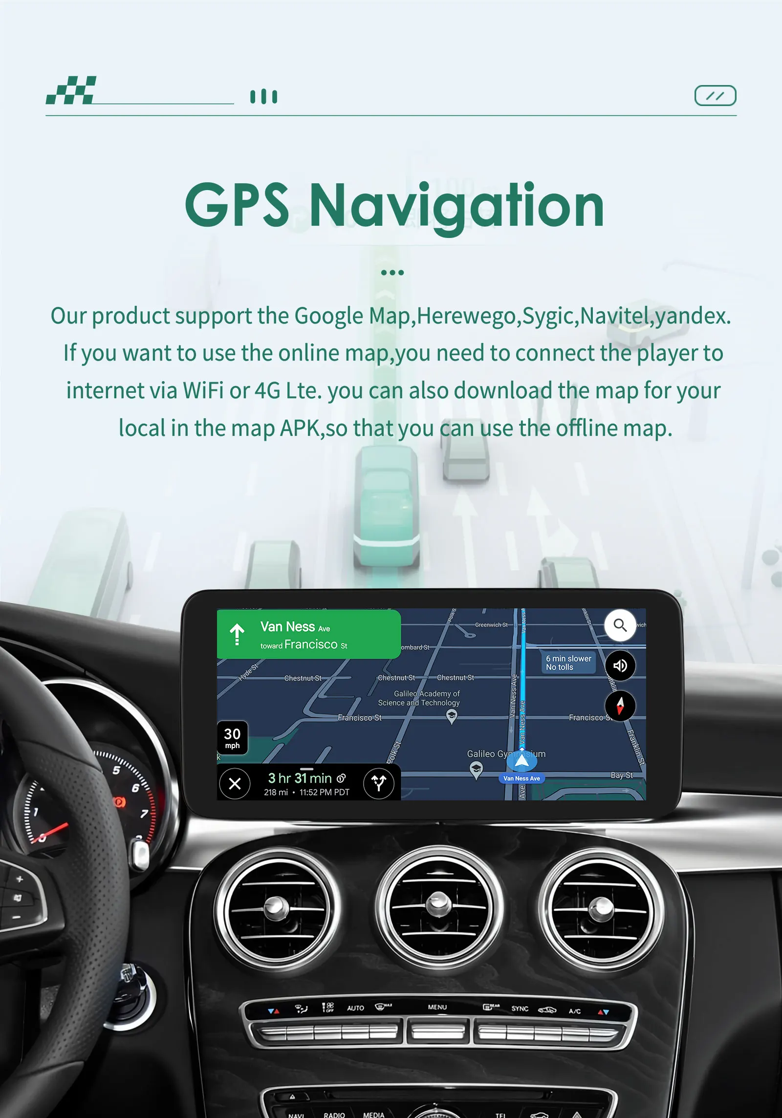 GPS Navigation: Our product support the Google Maps / Herwego / Sygic / Navitel / Yandex .