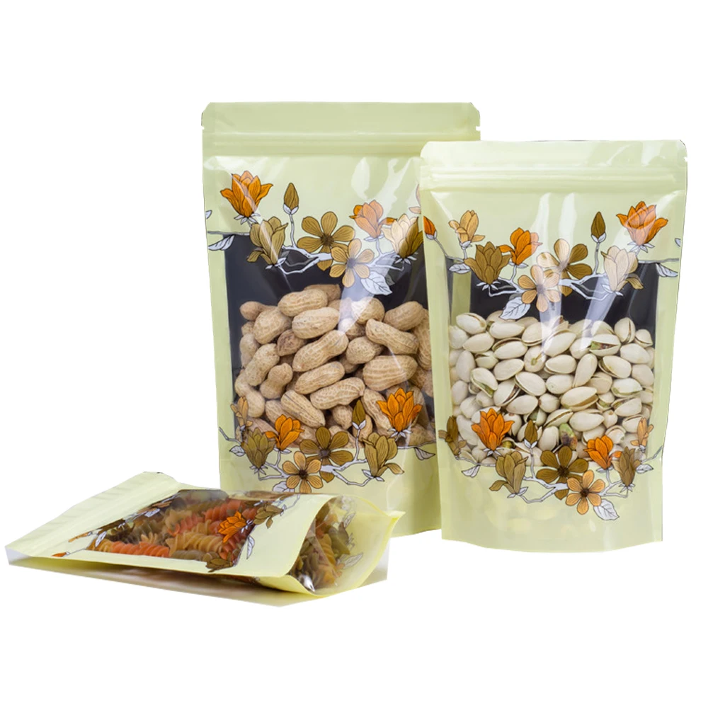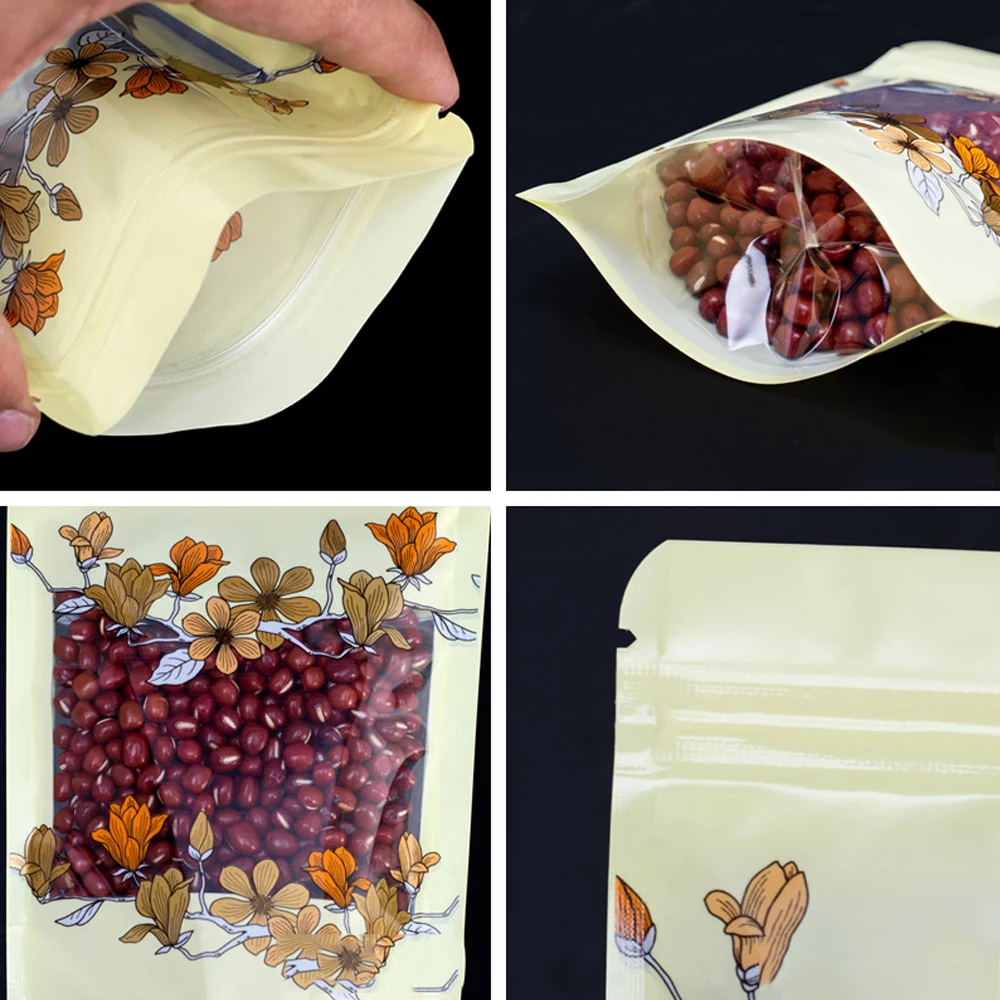 100Pcs/Lot Magnolia Flower Transparent Stand Up Bag Food Candy Tea Snacks Nuts Dried Fruits Waterproof Dustproof Tear Notch