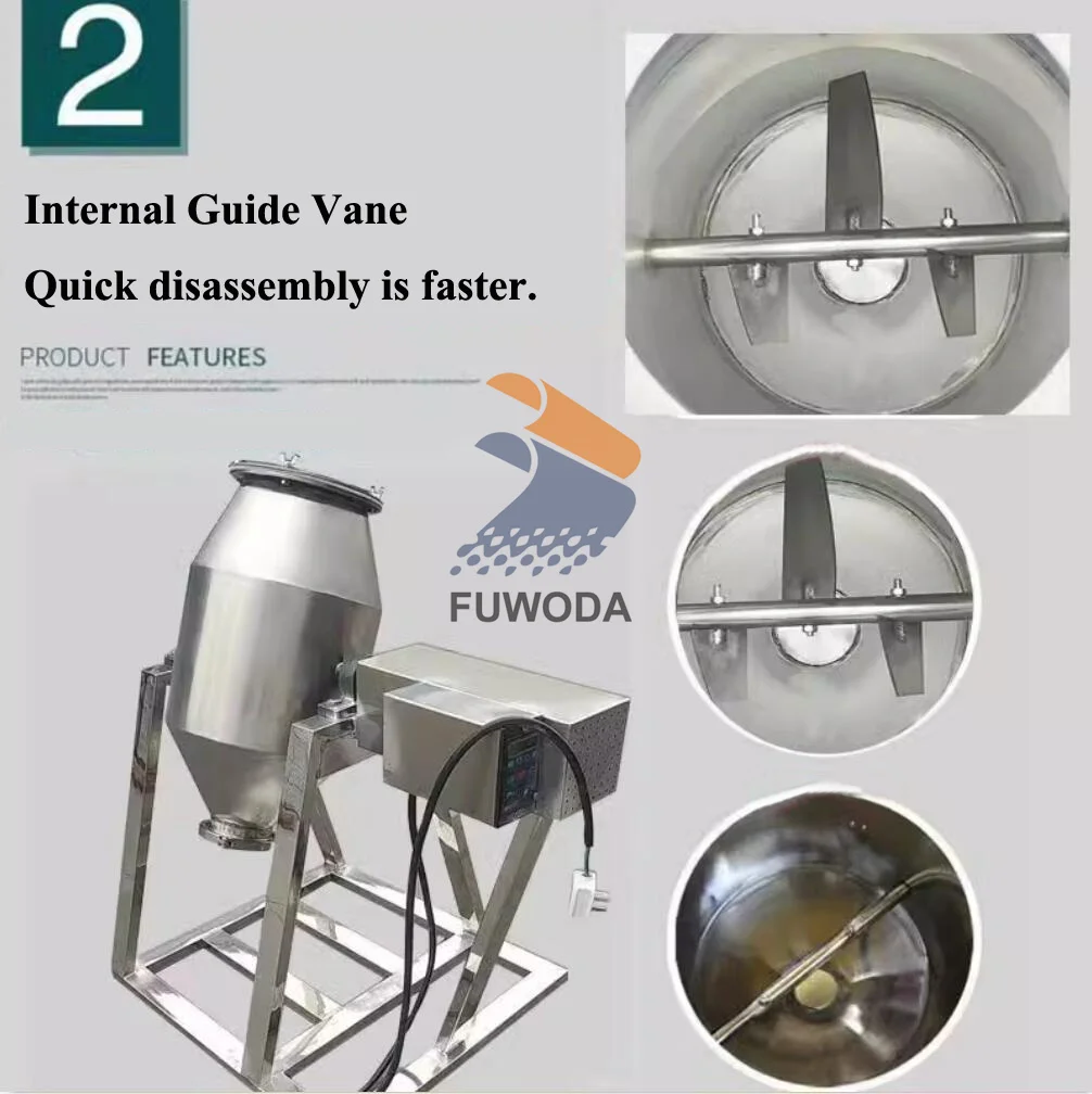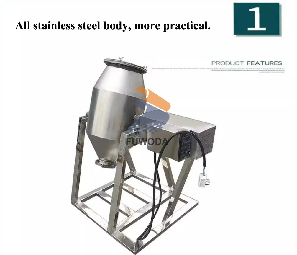 2.The mixer inner walls are smooth without any dead corner. The tank is provided with unique four-direction mixing movement track. With mixing evenness of 99%, high mixing precision and high speed, ideal mixing effect is achieved.