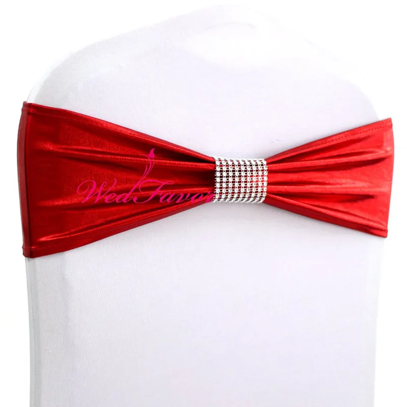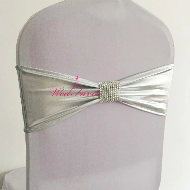 10pcs/50pcs Metallic Gold Silver Spandex Wedding Chair Sash Band Belts With Diamond Buckle Elastic Stretch Chair Bow Sash Tie