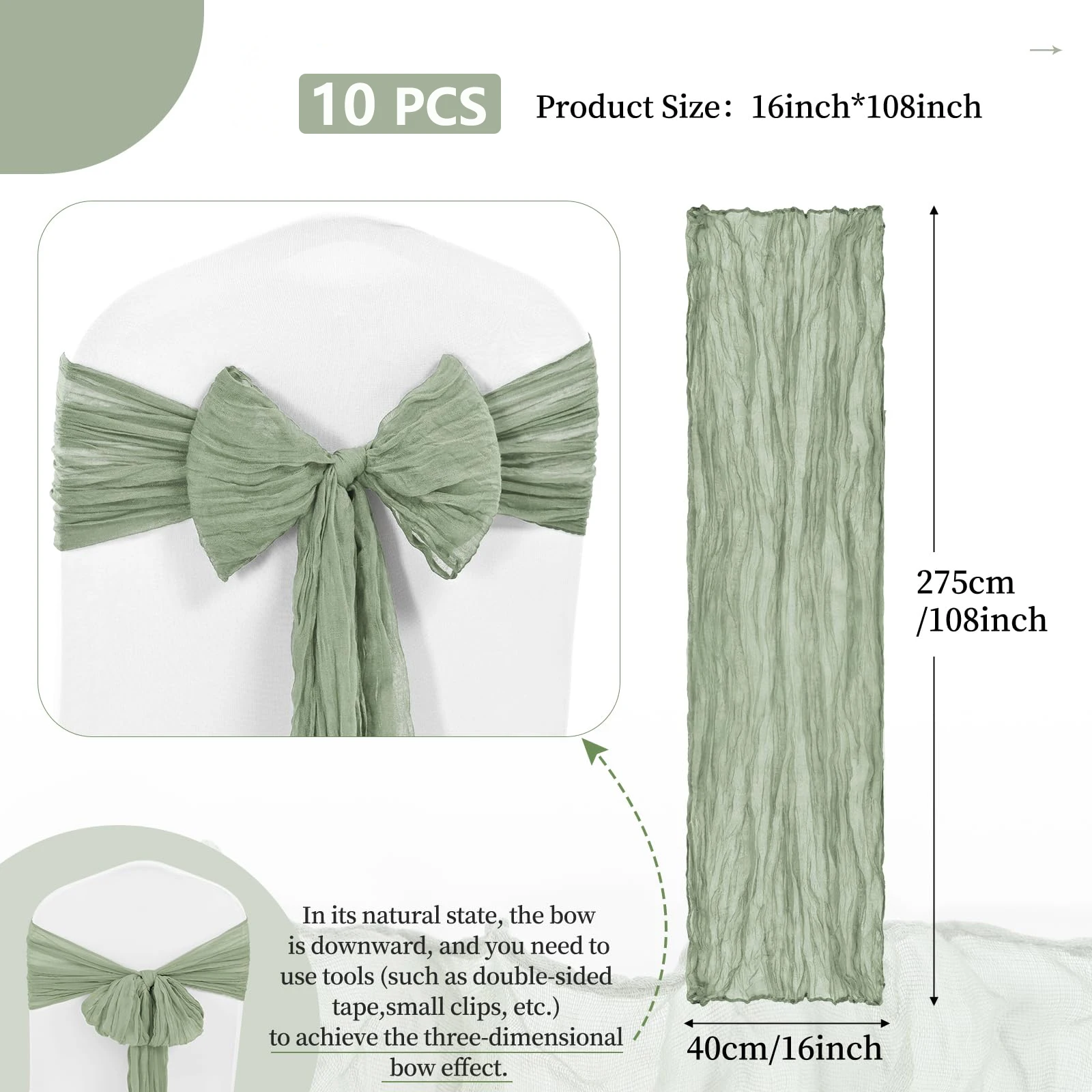 【Cheesecloth Chair Sashes】You will receive 10 pcs sage green cheesecloth chair sashes, enough for daily use. Each sage green chair sashes measures 275cm/108" long and 40cm/16" wide. The cheesecloth chair sashes toppers make the chairs more elegant and add sparkle to your party events.