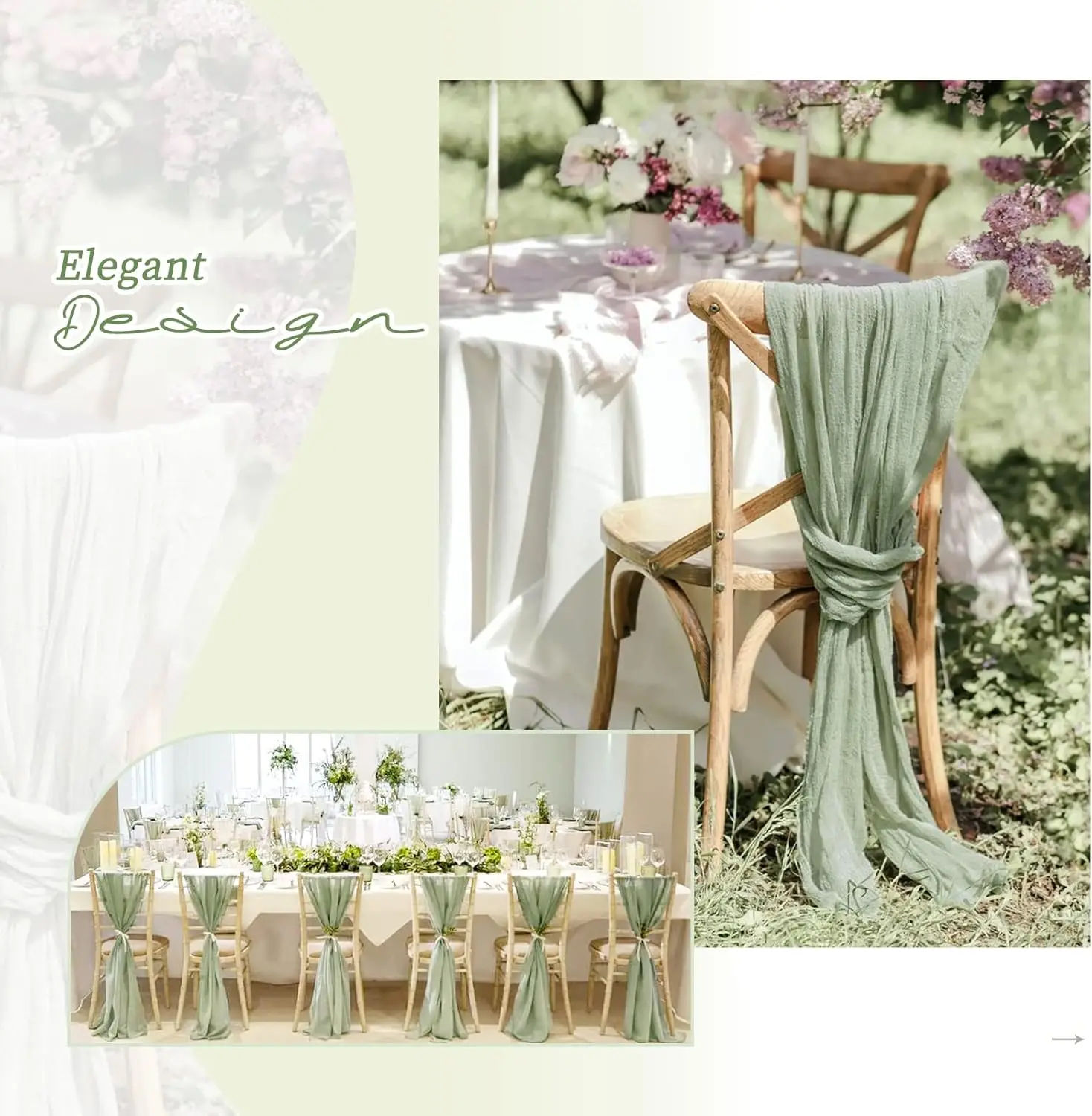 【Durable Cheesecloth Fabric】100% natural cheesecloth fabric. Soft to the touch, durable and reusable, the edge of the chair sash is locked with delicate stitching, not easy to fall off, and full of beauty. Sage green cheesecloth gauze chair sashes with folds are very elegant, high-end and romantic, and can be loosely scattered to the ground, and the beautiful folds add a retro atmosphere.