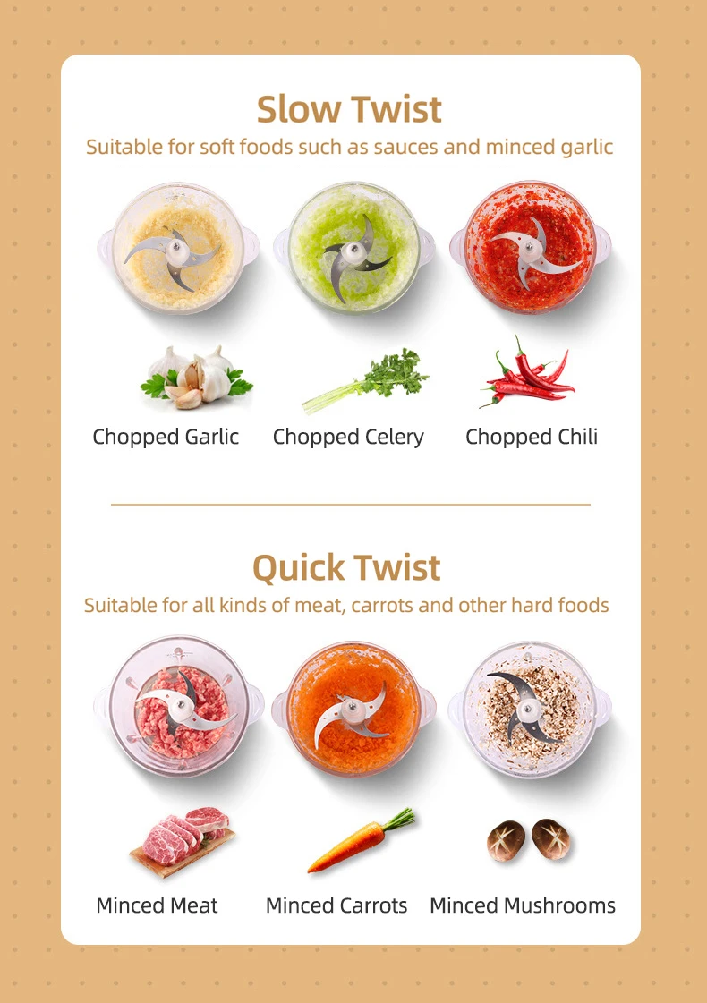 5. This meat grinder is made of food grade material and is safe to use. You can use it to chop up all kinds of ingredients including Onions, meat, vegetables, fruit and ham, baby food, garlic, Onions, herbs and more. Ideal gifts for wives, mothers and friends.